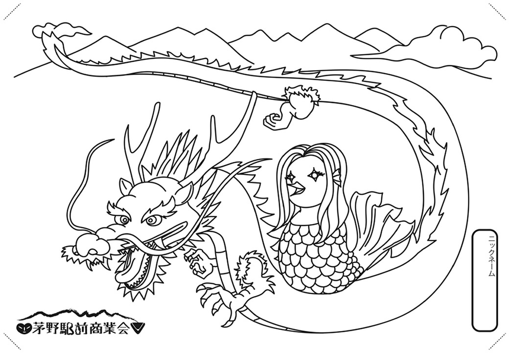 「諏訪の龍さま」と、自分の絵を描かせることで疫病を退散させる妖怪「アマビエ」のぬりえをしましょう。